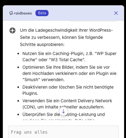 Der KI-Assistent zeigt im Chat-Fenster sogar Performance-Tipps an – Caching-Plugins, Bildoptimierung, CDN. Aber warum muss ich das manuell machen? Und woher weiß ich als Webdesign- oder WordPress-Laie wie das überhaupt funktioniert?